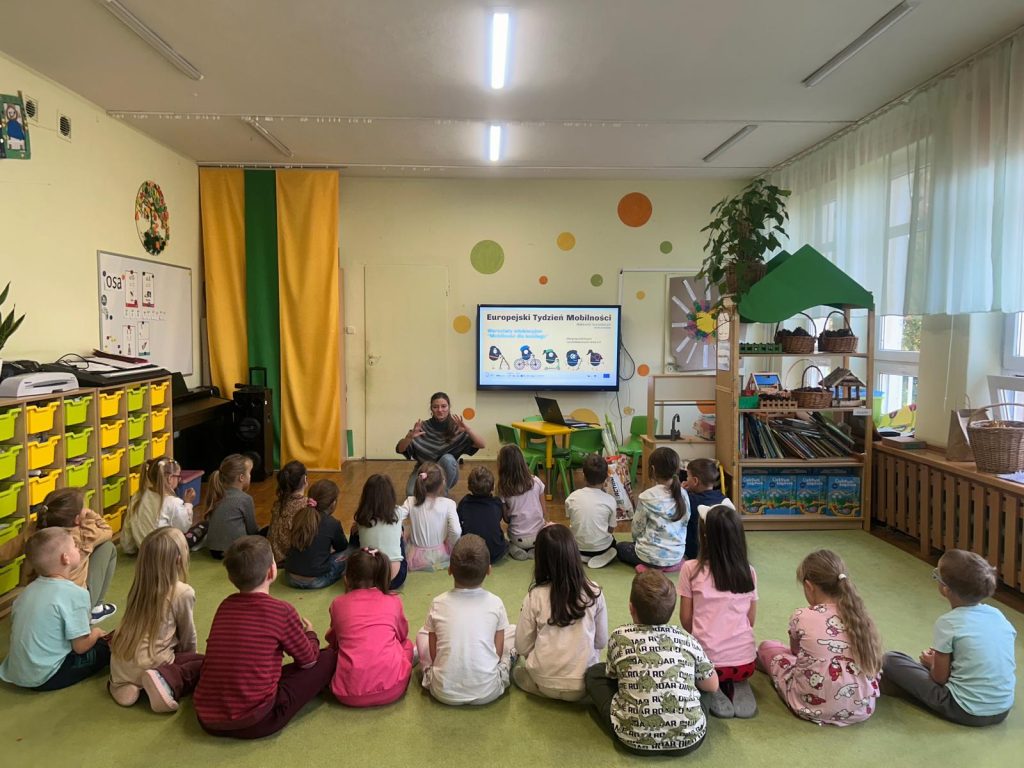 Pani Hania opowiedziała dzieciom o tym co to jest mobilność, transport. Rozmawialiśmy o przyrodzie, zieleni, zwierzętach i zanieczyszczeniu środowiska oraz hałasie. Rysowaliśmy obrazki na temat innego sposobu przemieszczania się niż jazda samochodem.