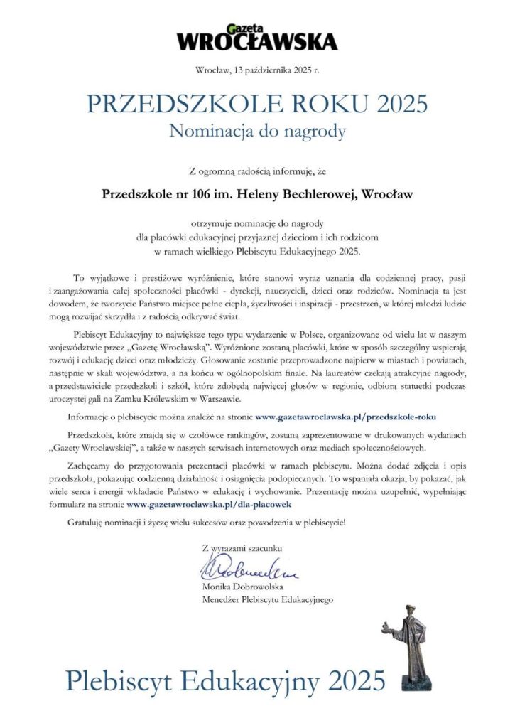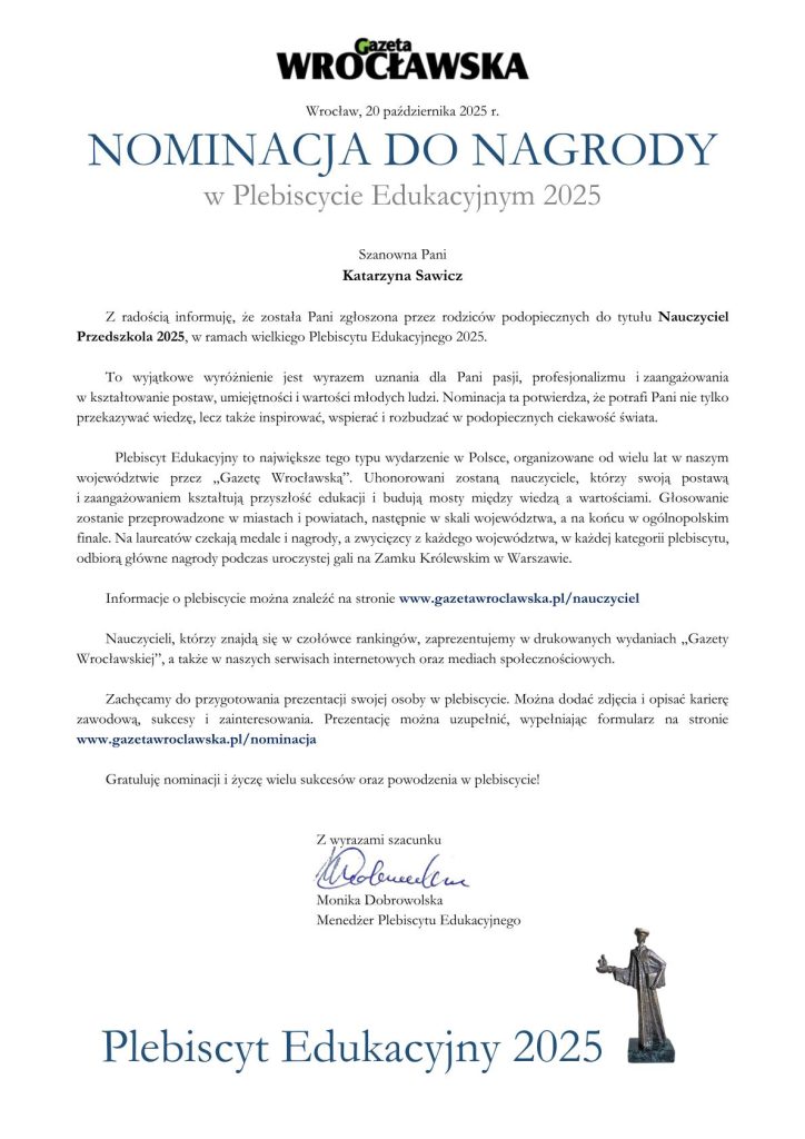 Z ogromną przyjemnością pragniemy poinformować, że nasza placówka edukacyjna została zgłoszona do nagrody w kategorii Przedszkole Roku w tegorocznej edycji Plebiscytu Edukacyjnego 2025. Dodatkowo nominację do nagrody dla najlepszych nauczycieli otrzymała: w kategorii Nauczyciel przedszkola: Katarzyna Sawicz nauczycielka z grupy 4