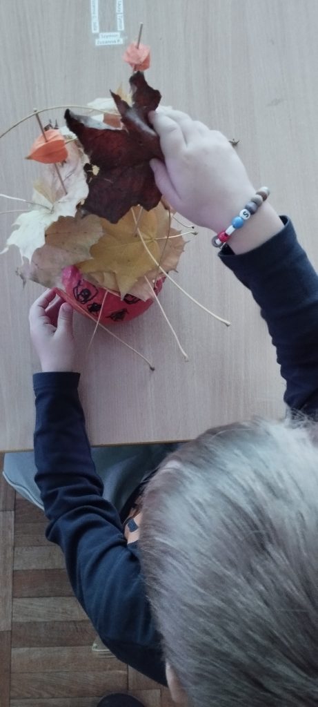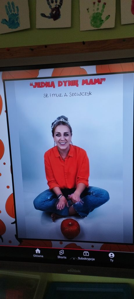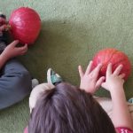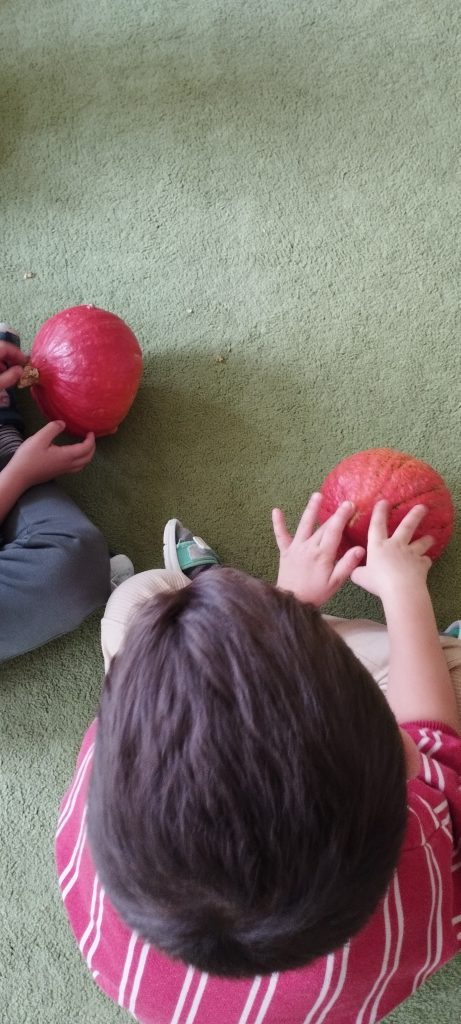 W naszej sali na dywanie pojawiła się sterta dyni. Dynie były różnej wielkość, kształtów i kolorów. Każde dziecko wybierało dynię, która mu się spodobała. Usiedliśmy w kole z wybranymi dyniami na dywanie. Wspólnie zaśpiewaliśmy rymowankę „Jedną dynię mam…”i pobawiliśmy się naszymi dyniami. Namalowaliśmy na naszych dyniach śmieszne buźki ,a potem zrobiliśmy jesienne fryzury z liści. Kolejno dzieci wymyślały imiona dla swoich dyniowych stworków.