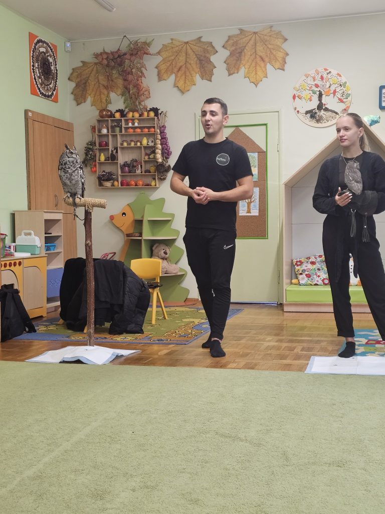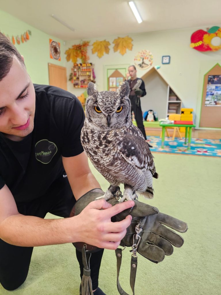 Dzisiejszy dzień w naszym przedszkolu był absolutnie wyjątkowy – taki, który na długo zapadnie w pamięci Przedszkolaków:) Sala wypełniła się niezwykłą atmosferą, gdy w progu pojawili się opiekunowie z ZooManii, a wraz z nimi… ciche, dostojne i pełne tajemnic SOWY:) Dzieci mogły przyjrzeć się z bliska ptakom, które zwykle znamy tylko z książek i opowieści. Widok wielkich, mądrych oczu oraz aksamitnych skrzydeł robił niesamowite wrażenie. Przedszkolaki słuchały z zapartym tchem opowieści o sekrecie bezszelestnego lotu, o niezwykłym słuchu oraz roli,jaką sowy pełnią w leśnym świecie. Jednak największy zachwyt wywołał moment kiedy każdy z nas mógł w bardzo bliskiej odległości stanąć przy sowach i przyjrzeć się z dokładnością przyrodnika:)