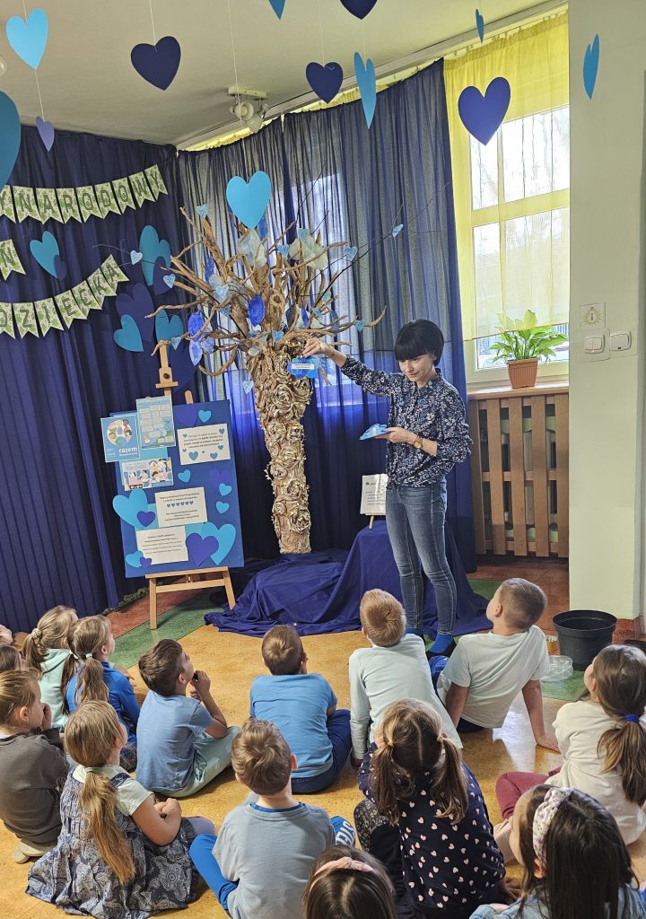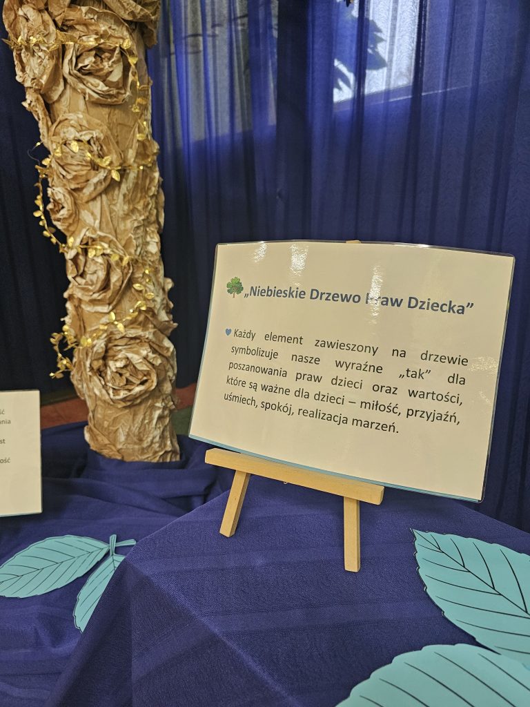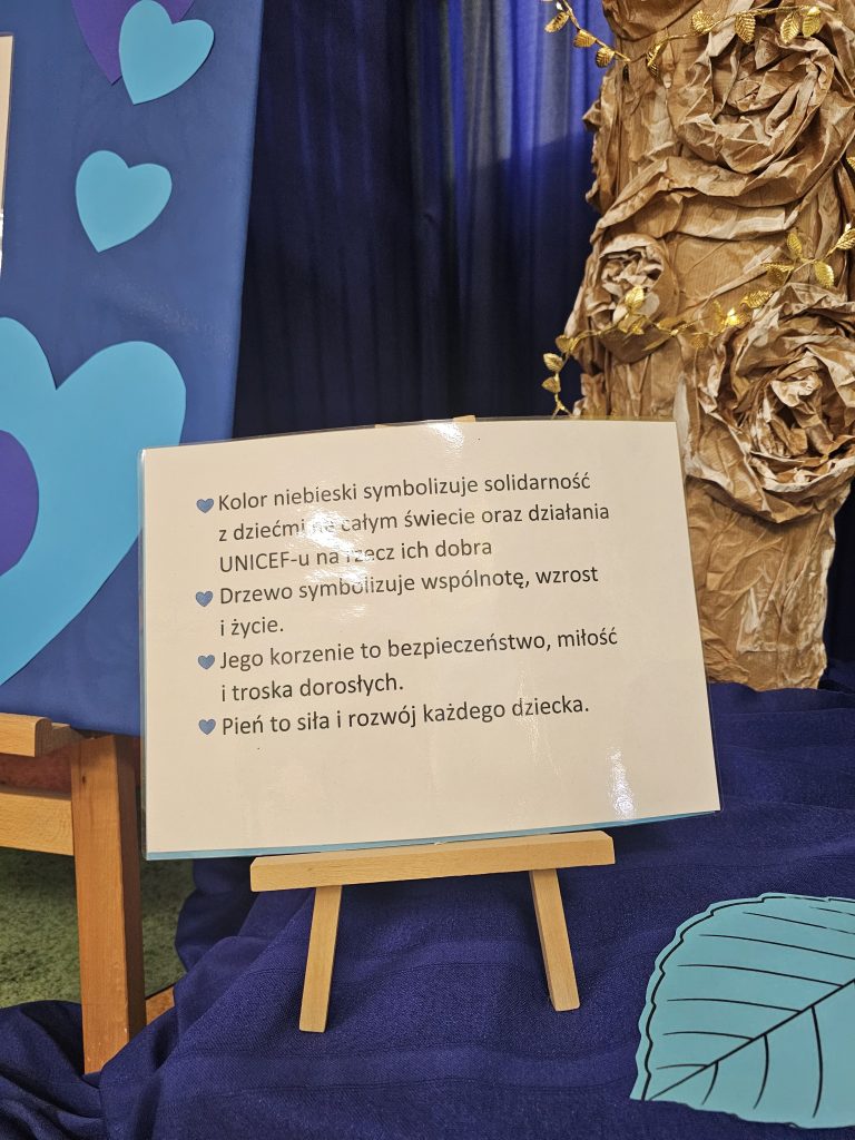 W ramach obchodów Międzynarodowego Dnia Praw Dziecka z UNICEF w naszym przedszkolu zrealizowaliśmy szereg wyjątkowych działań, które wprowadziły dzieci w świat ich praw w sposób bliski, angażujący i pełen radości. Powstała symboliczna instalacja „Drzewo Praw Dziecka”, na której każda grupa zawiesiła niebieski element – kolor UNICEF – podkreślający jedność i wspólne wartości.