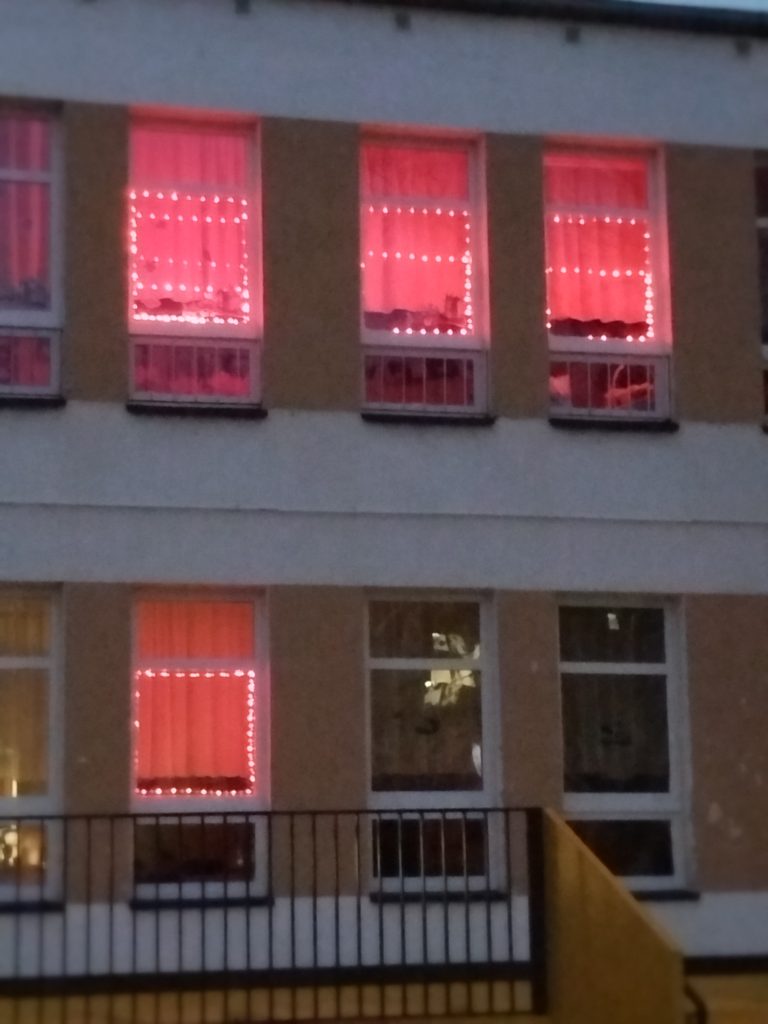 19.11.25r. nasze przedszkole rozświetliło się na czerwono w związku z solidarnością w Kampanii Dzieciństwo bez Przemocy.