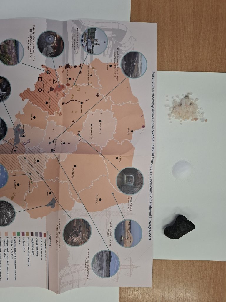 Dzieci poznawały surowce mineralne w sposób wielozmysłowy – mogły je oglądać, dotykać, wąchać oraz sprawdzać ich twardość. Wśród badanych materiałów znalazły się: bryłka soli kamiennej, bryłki węgla, piasek kwarcowy oraz naturalna glina. Bezpośredni kontakt z surowcami wzbudził ogromne zainteresowanie i zachęcił do zadawania pytań oraz formułowania własnych wniosków.