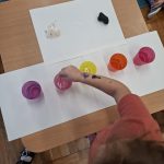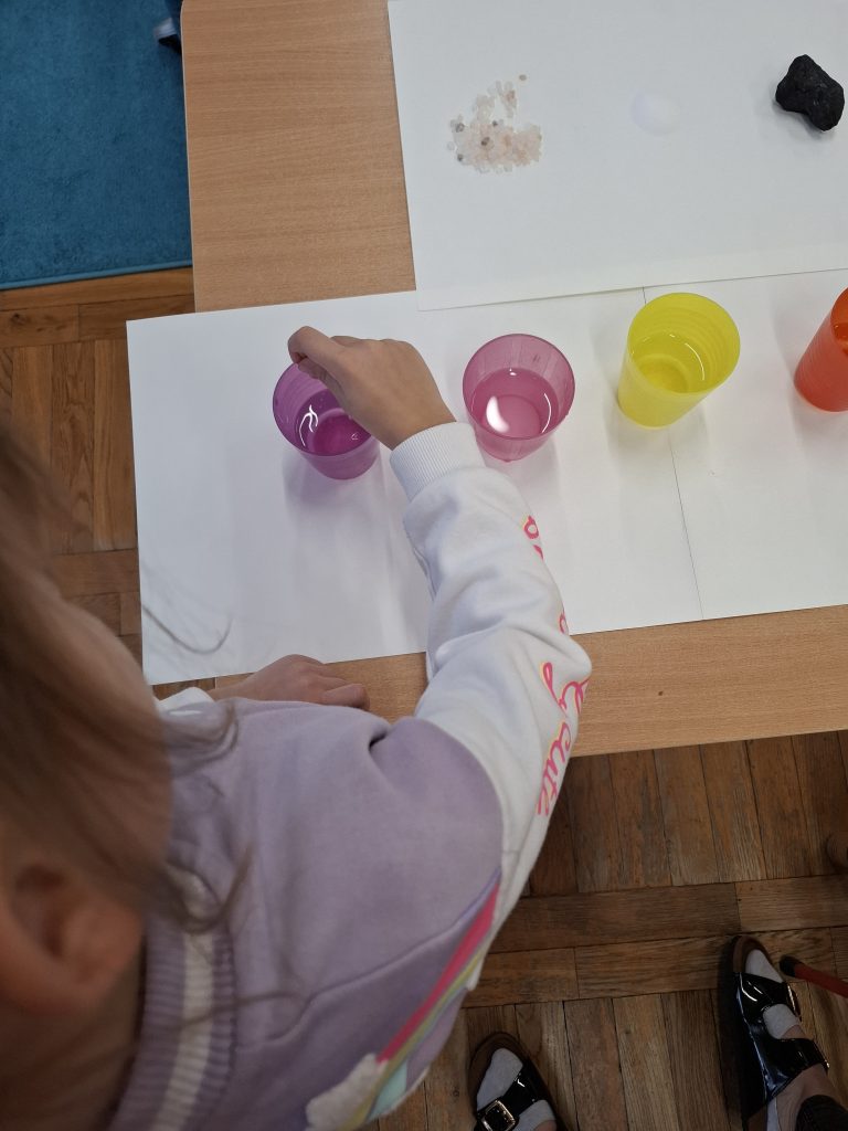 Na zakończenie dzieci wcieliły się w rolę poszukiwaczy surowców. Podczas zabawy badawczej obserwowały i eksperymentowały z materiałami zmieszanymi z wodą, sprawdzając, które surowce rozpuszczają się w wodzie, a które nie. Zajęcia połączyły naukę z radością odkrywania, rozwijając ciekawość świata, umiejętność obserwacji oraz myślenie przyczynowo-skutkowe.