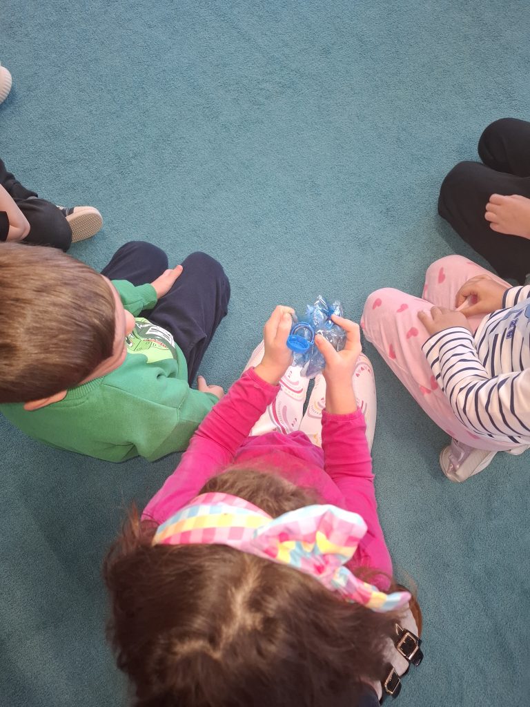 Kolejnym etapem był test wodny, podczas którego przedszkolaki obserwowały, jak te same materiały zachowują się w kontakcie z wodą. Sprawdzały, które przedmioty unoszą się na powierzchni, a które opadają na dno, a także jak woda wpływa na ich wygląd i strukturę. Doświadczenie to pozwoliło dzieciom zrozumieć, że różne materiały mają odmienne właściwości i reagują inaczej na czynniki zewnętrzne.