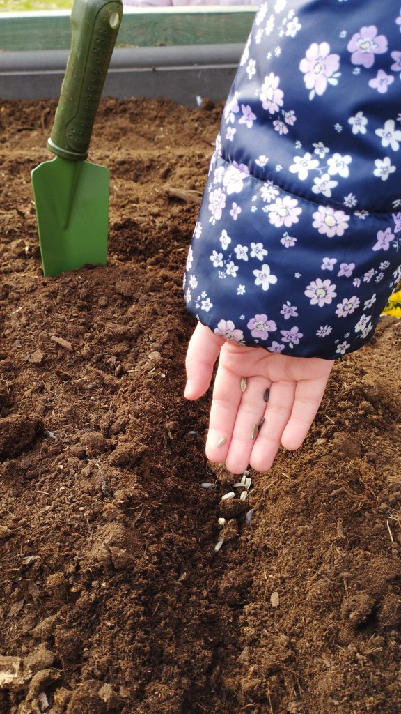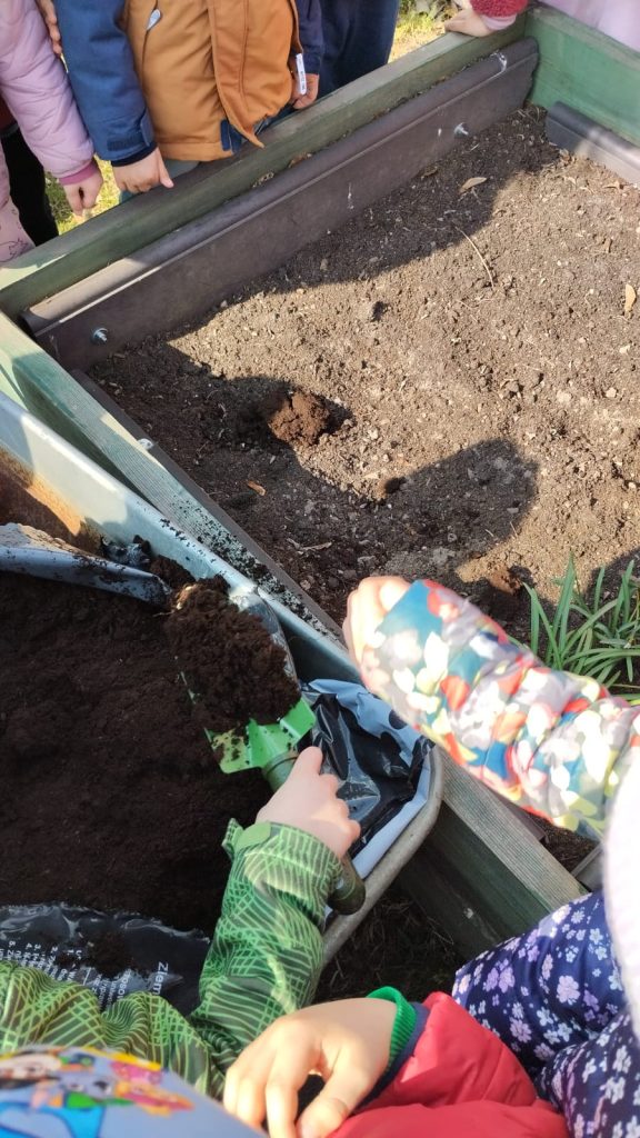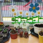 W czasie realizacji kręgu tematycznego „Witaj Wiosno” poznaliśmy pierwsze wiosenne kwiaty. Nauczyliśmy się nazywać części budowy roślin cebulkowych i nasiennych. Założyliśmy hodowle fasoli metodą hydroponiczną i ziemną, aby obserwować wzrost roślin. W naszym przedszkolnym ogrodzie zasialiśmy kwiaty w skrzyni, którą wcześniej przygotowaliśmy do wiosennego zasiewu uzupełniając pulchną i żyzną ziemią. Prace ogrodowe były dla nas ciekawym i zajmującym doświadczeniem. Byli wśród nas także, poszukiwacze przyrodniczych skarbów, którzy zbudowali ognisko z patyczków i ułożyli „Stonogę” z pustych łupin orzecha włoskiego.