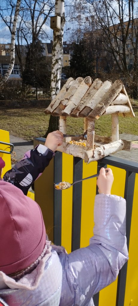 W naszym przedszkolnym ogrodzie obserwowaliśmy ptaki, które są wokół nas. Nauczyliśmy się rozpoznawać i nazywać gatunki ptaków , które zimują w Polsce. Rozumiejąc ich trudności w znalezieniu pokarmu zimą , postanowiliśmy im pomóc. Przygotowaliśmy różne gatunki ziaren zbóż, które wsypaliśmy do karmnika. Na gałęziach zawiesiliśmy „kule zbożowe”. Przez okno …